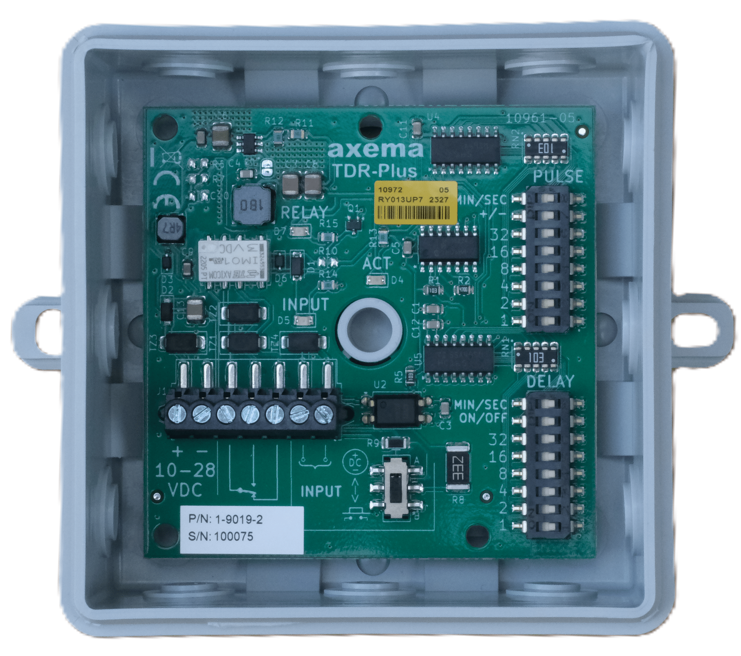 TDR-Plus är ett hjälprelä med aktiveringsingång ställbar att reagera på potentialfri slutning eller spänning (10-28 VDC).