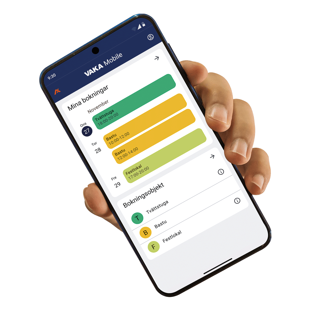 VAKA® Mobile är applikationen som gör det smidigare än någonsin att boka gemensamma utrymmen som fastighetens tvättstuga, gym eller övernattningslägenhet – direkt i mobilen. I appen visas alla lediga och uppbokade tider i den lättöverskådliga bokningskalendern. Planera, boka och avboka tid med ett enkelt knapptryck.